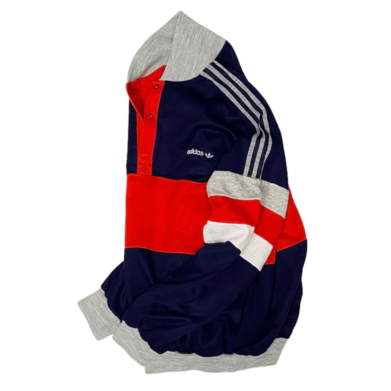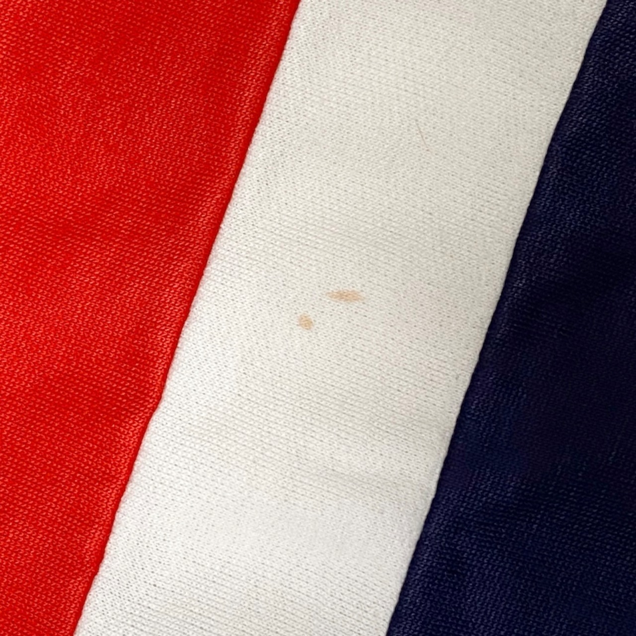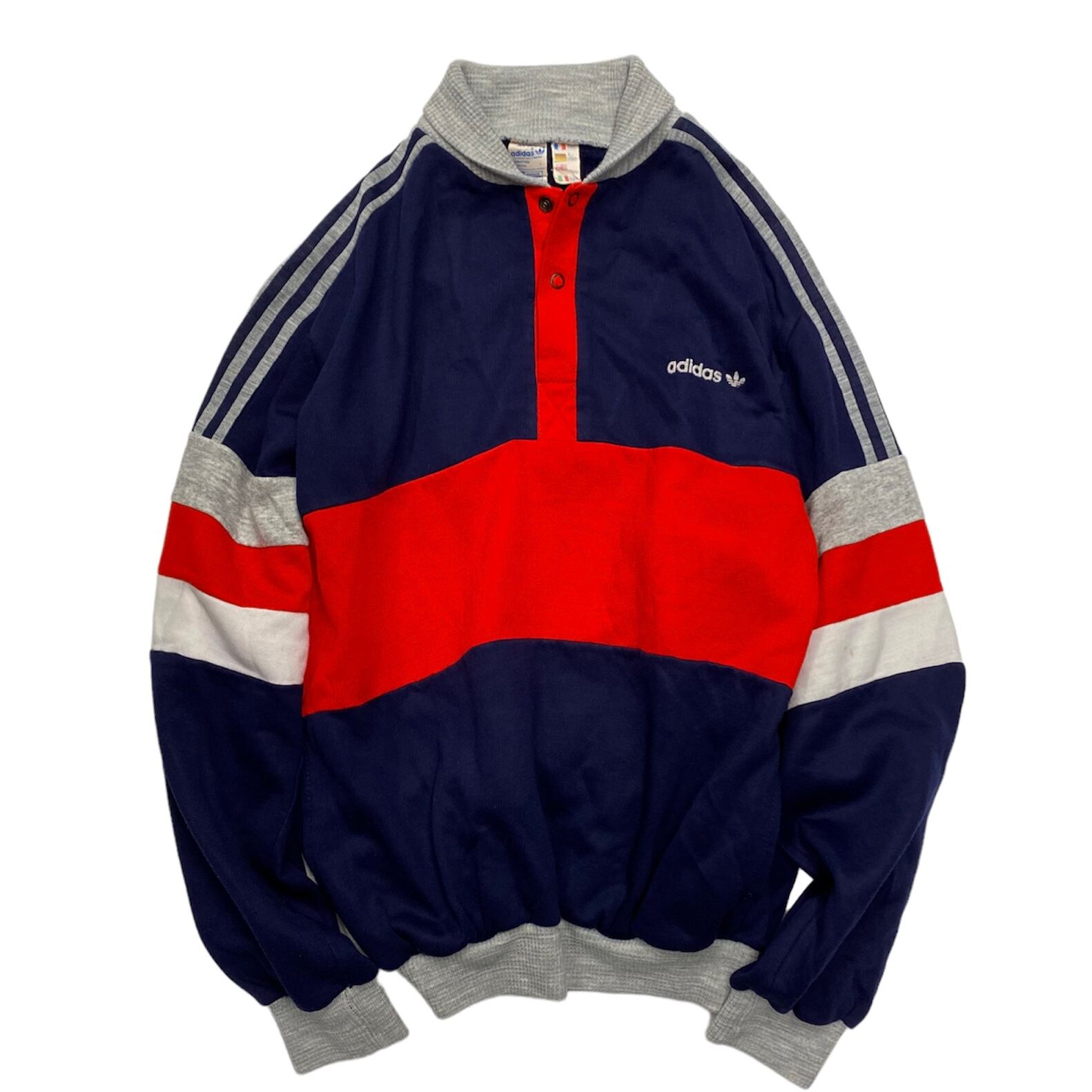 80年代フランス製のスナップボタンのスウェットです。サイズも大きめです。トリコロールカラーが良いですね。ポケット付いてるのも良し。
